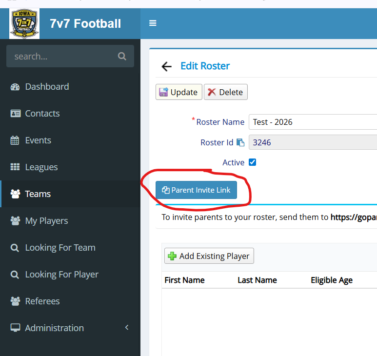 Click "Parent Invite Link" which will copy the invitation to your clipboard, then paste and send that to your parents! Make sure to do this for every team, as every roster has a different ID.